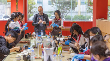 5月18日,在甘肃省定西市安定区博物馆,学生在陶罐上绘图。