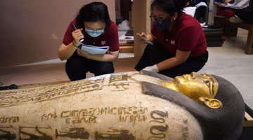 6月17日,在上海博物馆人民广场馆,萨卡拉考古遗址的彩绘人形棺开箱亮相。