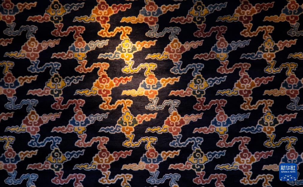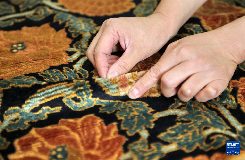 6月27日,在位于北京十里河的工作室,冀豫展示其团队的宫毯作品。