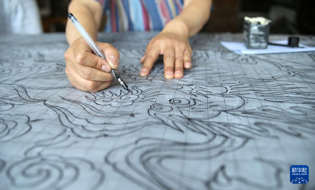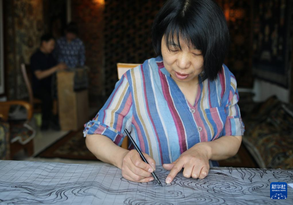 6月27日,在位于北京十里河的工作室,冀豫在描画宫毯设计图稿。