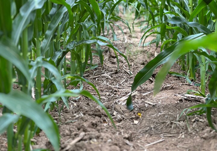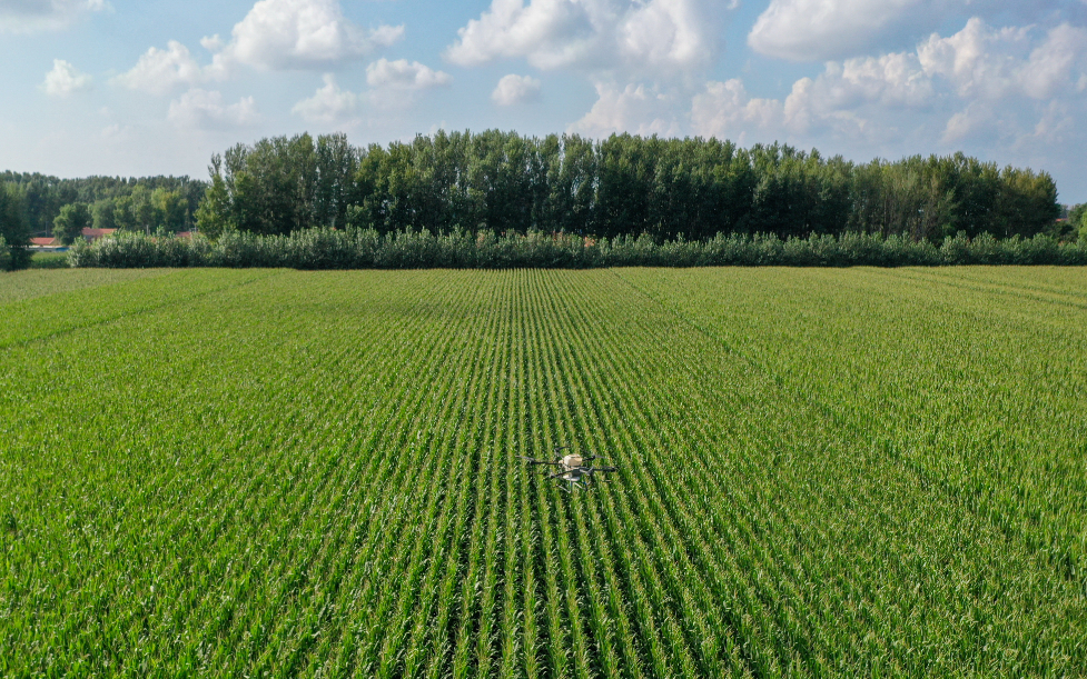 7月21日,在位于吉林省四平市梨树县的“科技小院”试验田,植保无人机为玉米精准施肥(无人机拍摄)。新华社记者 张楠 摄