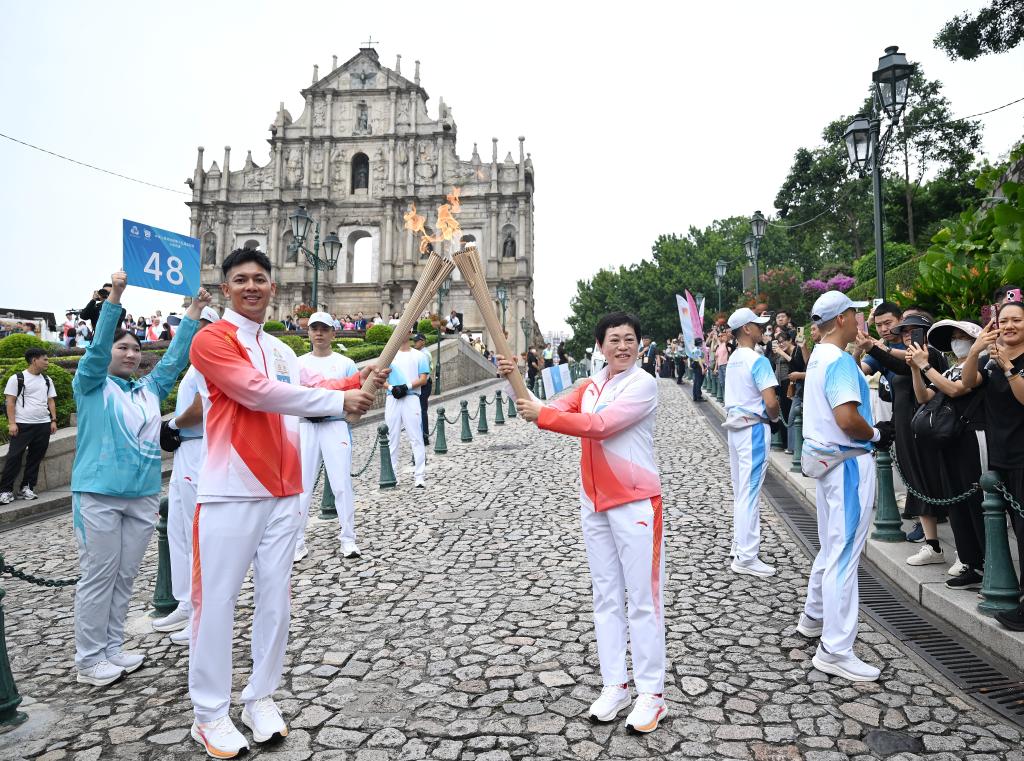 11月2日,火炬手陈虹(前右)、罗协铭在传递活动中交接圣火。当日,中华人民共和国第十五届运动会火炬传递澳门站举行。新华社发(张金加摄)