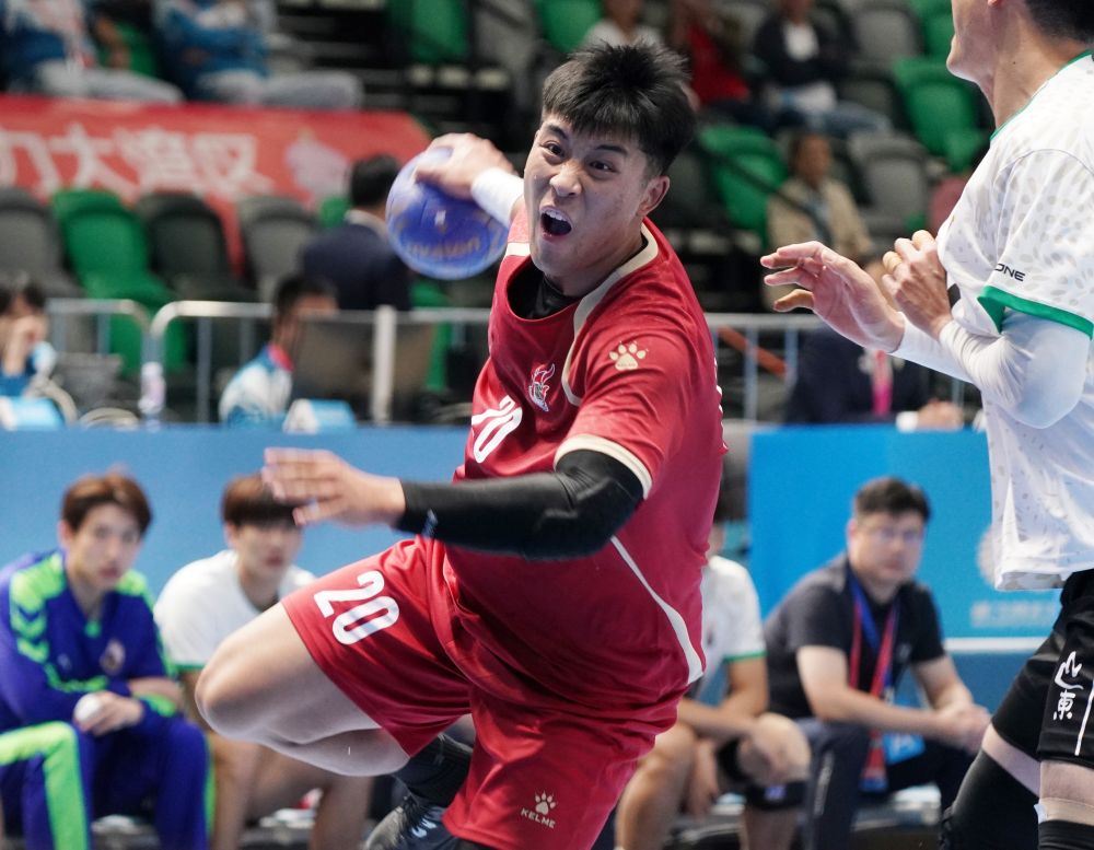 11月3日,山西队球员刘文东(左)在比赛中进攻。当日,在香港启德体艺馆举行的第十五届全国运动会男子手球预赛B组比赛中,山西队33比32战胜山东队。新华社发 (王申摄)