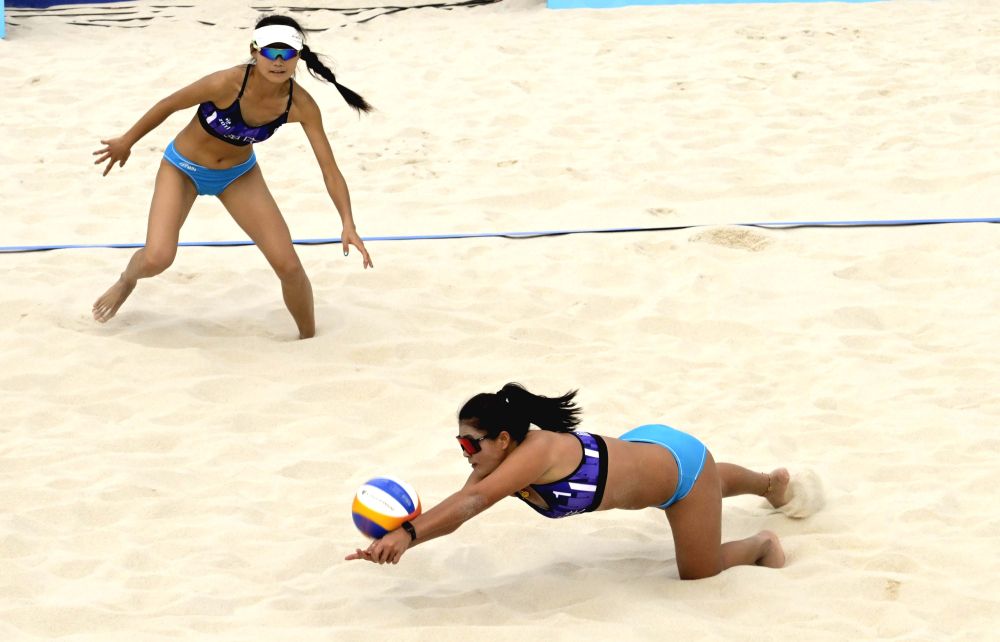 11月3日,颜云肖(前)/高月云在比赛中。当日,在香港举行的第十五届全国运会沙滩排球女子小组赛D组比赛中,浙江队组合王凡/姚欣2比1战胜重庆队组合颜云肖/高月云。新华社发(卢炳辉摄)