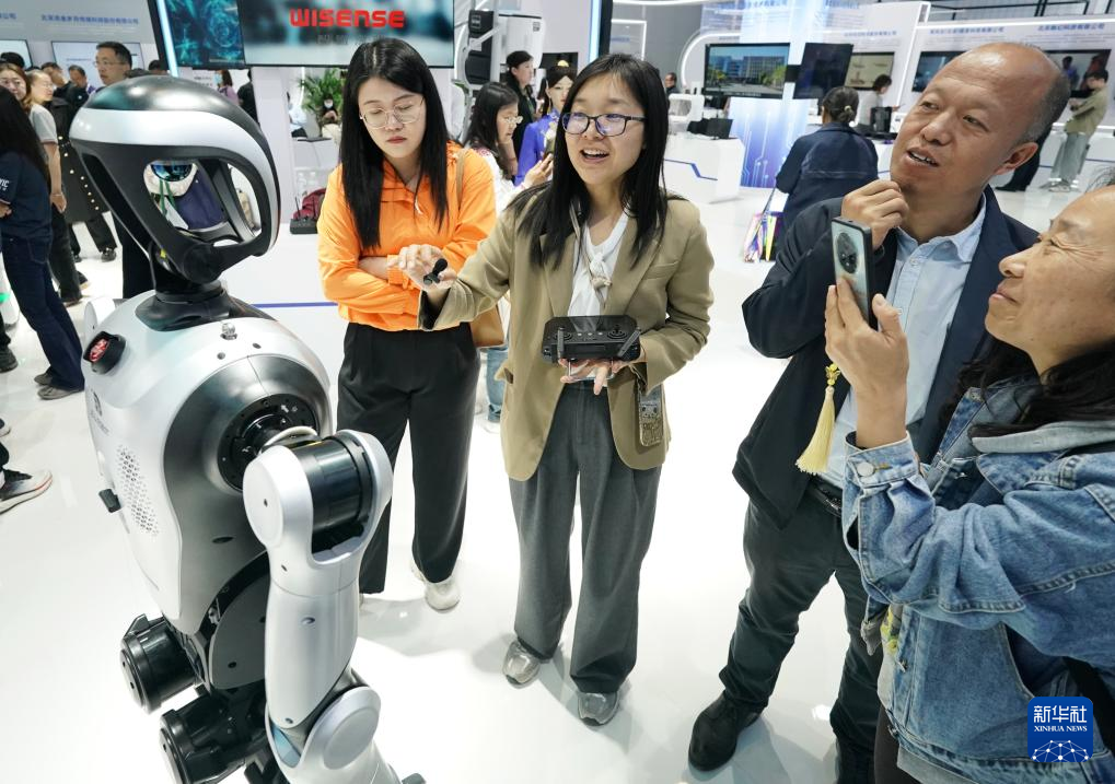 5月8日,工作人员在第二十七届中国北京国际科技产业博览会上向观众介绍一款人形机器人。