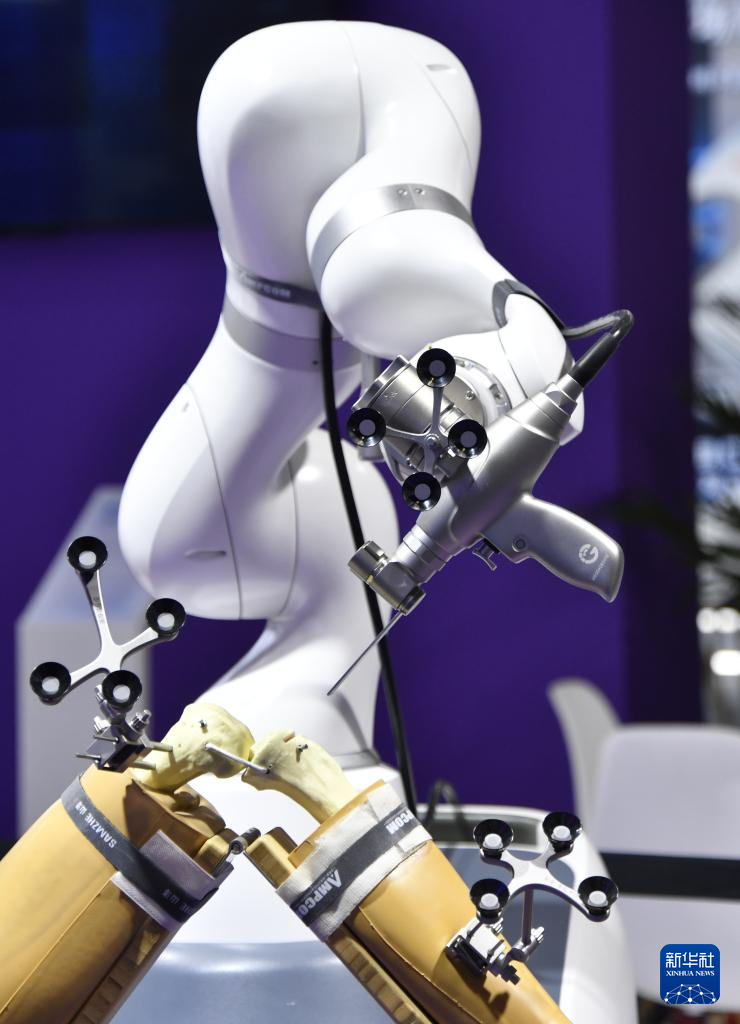 这是5月8日在第二十七届中国北京国际科技产业博览会拍摄的骨科智能手术机器人。