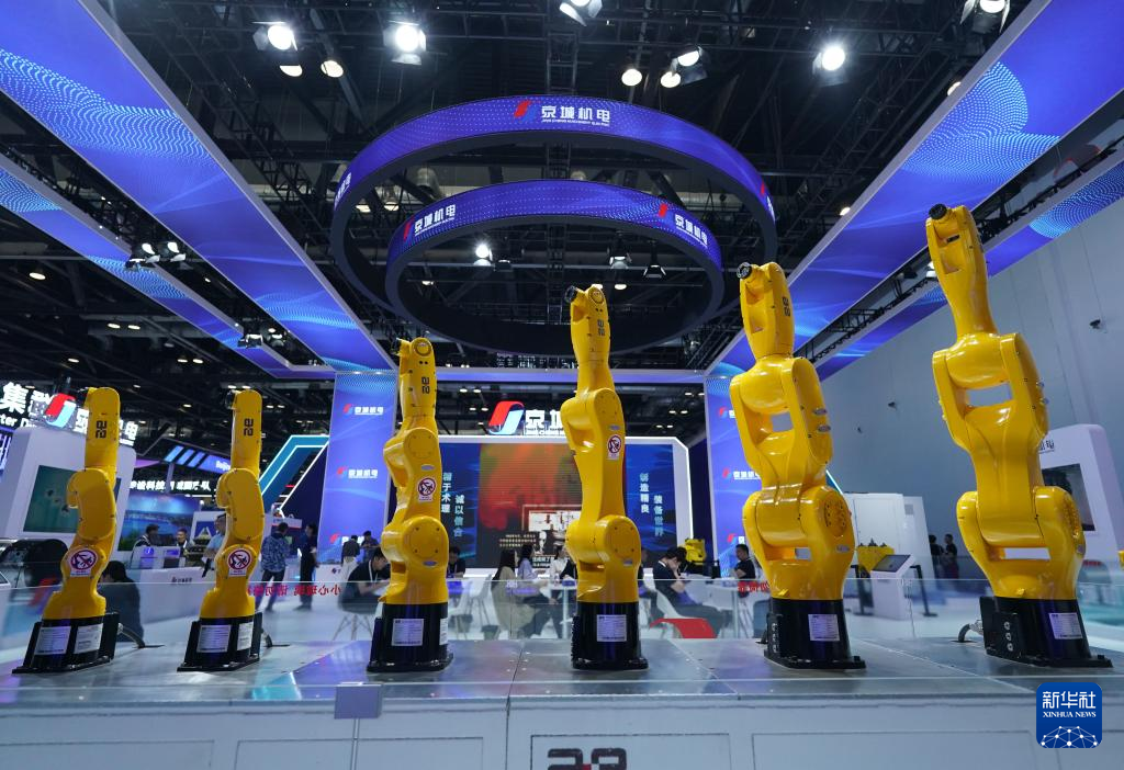 这是5月8日在第二十七届中国北京国际科技产业博览会拍摄的工业机器人。