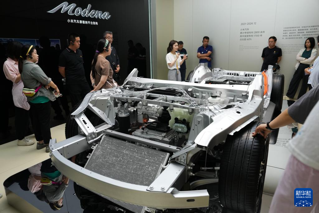 6月16日,参观者在北京小米汽车工厂的科技展厅了解小米汽车摩德纳平台架构。