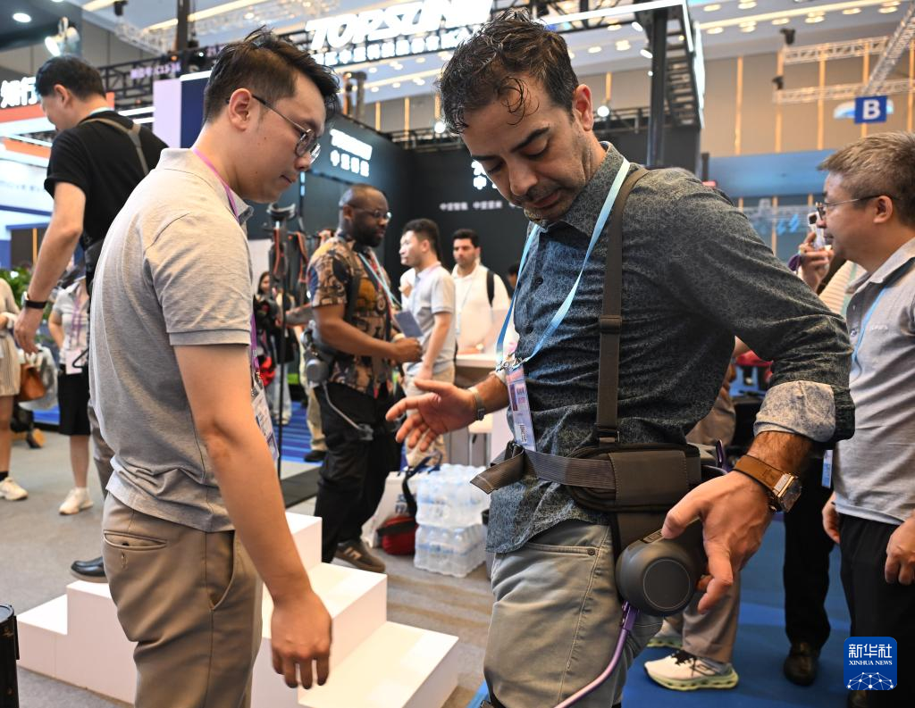 10月15日,境外采购商在第138届广交会服务机器人专区太希智能展台体验登山助行外骨骼穿戴设备。