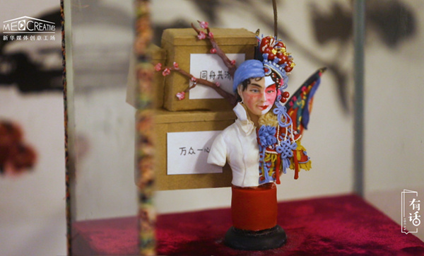 面塑俗稱面人,因為它主要的題材都是人物,所以老百姓們也管它叫面人。這個是“三八婦女節”那天做的,我看到當時有很多的醫護人員作為人類的代表跟另外一個物種去斗爭、保護我們,覺得她們還真的是很了不起的。想到以前巾幗英雄里邊穆桂英這個角色,加上京劇也是我們傳統文化中很寶貴的一個部分,就把這兩個結合在一起做了一個拼臉。