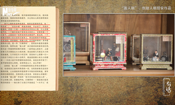 冰心先生的《小桔燈》散文集中,有一篇叫作《“面人郎”訪問記》的文章:“架子上擺的真是琳瑯滿目,他的比較新的作品,如“雞毛信”,“采茶撲蝶”等逼真細膩,不必說了;而我所最愛的,還是一小組一小組的舊北京街頭小景,什么賣糖葫蘆的,一個戴灰呢帽子穿黑色長袍的人,左臂挎著一個小籃子,上面插滿了各種各樣的冰糖葫蘆;剃頭的,一個披著白布的人低頭坐在紅板凳上,旁邊放著架子和銅盆;賣茶湯的;賣砂鍋的;吹糖人的;無不惟妙惟肖!”在文章當中,冰心先生也提到了,最令她心動的是一個打糖鑼的,這是她童年最喜歡、最熟悉的東西,她認為這也是“面人郎”最深刻的童年回憶。