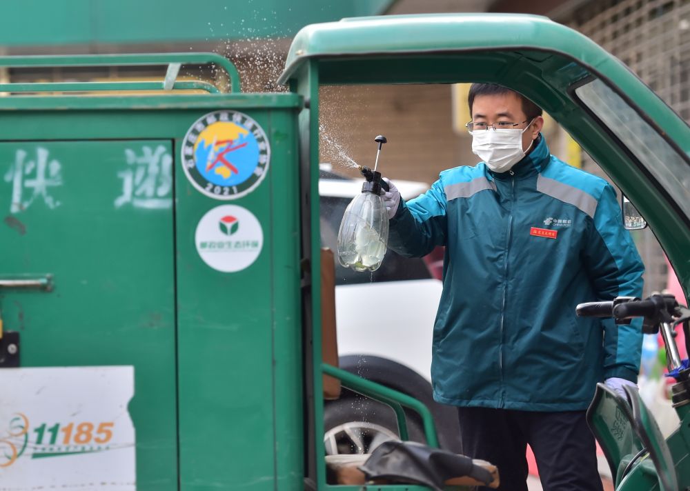 ↑1月10日,在石家莊市匯通路郵政快遞投遞部,工作人員對投遞車進行消殺。