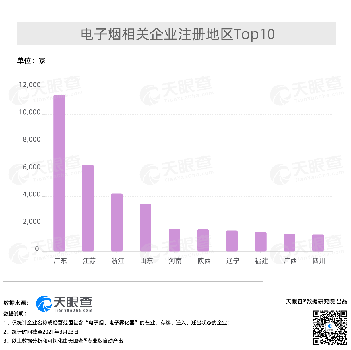 ????? 電子煙行業(yè)已經(jīng)在全球范圍內(nèi)顯露不可小覷的發(fā)展趨勢(shì),在中國(guó)也總體呈現(xiàn)上升趨勢(shì)。天眼查專業(yè)版數(shù)據(jù)顯示,目前我國(guó)共有超4.7萬家企業(yè)名稱或經(jīng)營(yíng)范圍含“電子煙、電子霧化器”。從地域分布上看,廣東的電子煙相關(guān)企業(yè)數(shù)量最多,超1.1萬家。據(jù)界面新聞此前報(bào)道,全球90%的電子煙都出自深圳寶安區(qū),這里已經(jīng)成為全球最大的電子煙生產(chǎn)基地,被稱為“全球霧谷”。