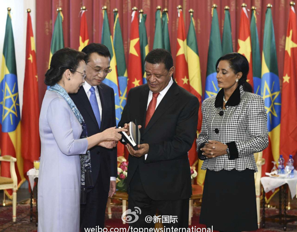 ??? 李克強(qiáng)與夫人程虹6日與埃塞俄比亞總統(tǒng)穆拉圖夫婦在總統(tǒng)官邸國家宮會見。李克強(qiáng)說,我們校友見面格外親切!總統(tǒng)先生在中國學(xué)習(xí)工作多年,為中埃、中非關(guān)系的發(fā)展作出了重要貢獻(xiàn)。穆拉圖總統(tǒng)曾在北京大學(xué)學(xué)習(xí)十余年,是李克強(qiáng)總理的校友,也是“中國通”。