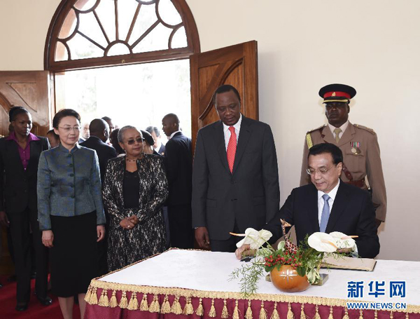 ??? 5月10日,中國國務院總理李克強在肯尼亞國家宮同肯總統肯雅塔舉行會談。這是會談開始前,李克強在貴賓簿上簽名。 新華社記者 李學仁 攝
