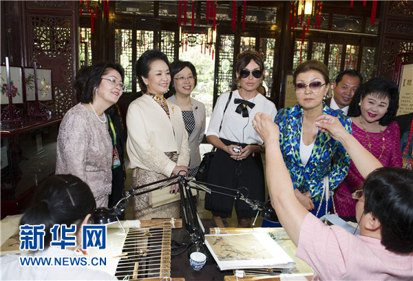 ????彭麗媛陪同來賓們觀看金山農(nóng)民畫、面塑、顧繡、木版水印、扎染,她們邊看邊聽取上海工藝美術(shù)博物館負(fù)責(zé)人的介紹,饒有興趣地欣賞非物質(zhì)文化遺產(chǎn)傳承人的絕活兒,對(duì)民間藝術(shù)家們的精湛技藝贊不絕口。