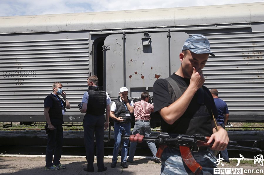 當地時間2014年7月20日,烏克蘭頓涅茨克Torez,馬航墜機遇難乘客遺體被裝上列車冷藏車廂將被運走。載有部分遺體的火車從距空難現場不遠的烏克蘭托列茲市出發,前往頓涅茨克市。火車離站前,身處空難現場的歐洲安全與合作組織(歐安組織)代表檢查了運載遺體的5節冷藏車廂。