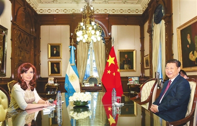 7月18日,國(guó)家主席習(xí)近平在布宜諾斯艾利斯同阿根廷總統(tǒng)克里斯蒂娜舉行會(huì)談,兩國(guó)元首就中阿關(guān)系及共同關(guān)心的問(wèn)題深入交換意見(jiàn),達(dá)成重要共識(shí),一致決定將中阿關(guān)系提升為全面戰(zhàn)略伙伴關(guān)系,堅(jiān)定把對(duì)方視為重要發(fā)展機(jī)遇和發(fā)展伙伴,加強(qiáng)互利合作和戰(zhàn)略協(xié)作,造福兩國(guó)和兩國(guó)人民,增強(qiáng)新興市場(chǎng)國(guó)家和發(fā)展中國(guó)家團(tuán)結(jié)合作。
