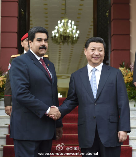 ????新華網(wǎng)北京7月21日電 據(jù)新華社“新國際”微博報道,習近平20日同馬杜羅總統(tǒng)會談時說,我們要加強頂層設計,以金融和投資為引擎,以能源合作為主軸,基礎設施建設、農業(yè)、礦業(yè)、科技合作等多個輪子一起轉,促進中委合作全方位發(fā)展。(李學仁攝)