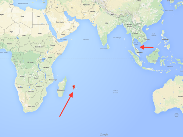 (左側(cè)箭頭是殘骸發(fā)現(xiàn)地,右側(cè)為MH370最后信號(hào)的發(fā)出地)
