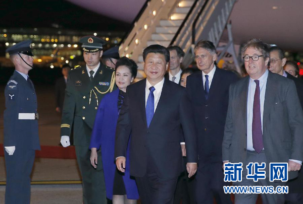 當地時間晚8時許,習近平乘坐的專機抵達倫敦希思羅機場。習近平和夫人彭麗媛在機場受到英國女王代表胡德子爵、外交大臣哈蒙德等熱情迎接。英國青年向習近平夫婦獻上鮮花。