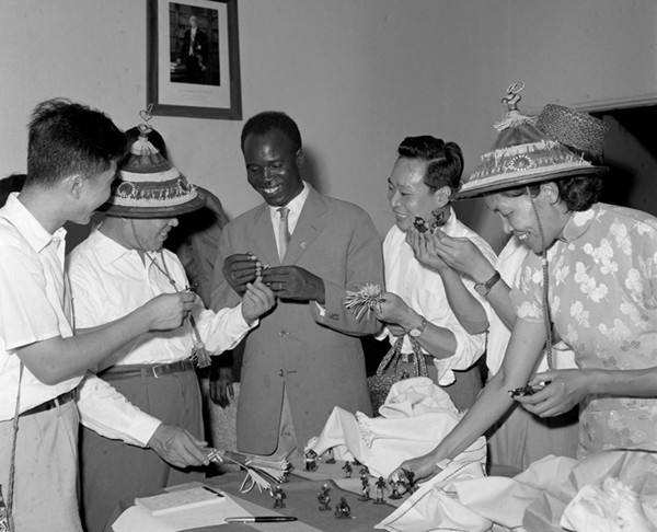 中非人民友好協(xié)會代表團在1961年2月24日到6月19日的四個月中,訪問了幾內亞、馬里、加納、尼日爾等八個西非國家。圖為非洲朋友向代表團贈送禮品。(新華社記者孟憲全攝)