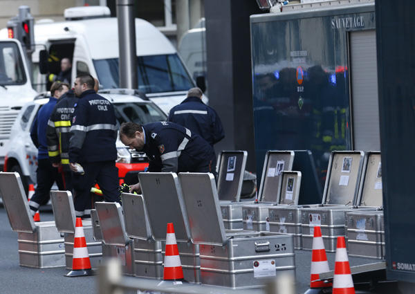 3月22日,在比利時首都布魯塞爾發(fā)生恐怖爆炸事件的馬埃勒貝克地鐵站外,警方調(diào)查人員正在取證。新華社記者葉平凡攝