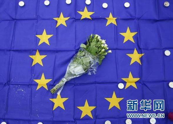 3月23日,在比利時首都布魯塞爾市中心的股票交易所前,一束鮮花和蠟燭擺放在歐盟旗幟上。當日,數千民眾自發聚集在股票交易所前,為恐怖襲擊遇難者集體默哀。 新華社記者 葉平凡 攝