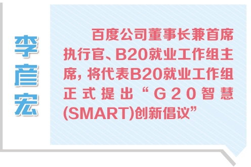 就業(yè)是B20的重點(diǎn)議題之一,也是當(dāng)今世界面臨的重要問(wèn)題之一。如何創(chuàng)造更加充分、更高質(zhì)量的就業(yè)機(jī)會(huì),推動(dòng)實(shí)現(xiàn)經(jīng)濟(jì)的持續(xù)和平衡增長(zhǎng),是各國(guó)面臨的重要任務(wù)。根據(jù)G20杭州峰會(huì)的“創(chuàng)新增長(zhǎng)方式”議題,B20就業(yè)工作組主席、百度公司董事長(zhǎng)兼首席執(zhí)行官李彥宏代表B20就業(yè)工作組提出了“G20智慧(SMART)創(chuàng)新倡議”。這一倡議得到了二十國(guó)集團(tuán)工商界、商協(xié)會(huì)、國(guó)際機(jī)構(gòu)和智庫(kù)代表的廣泛認(rèn)可。