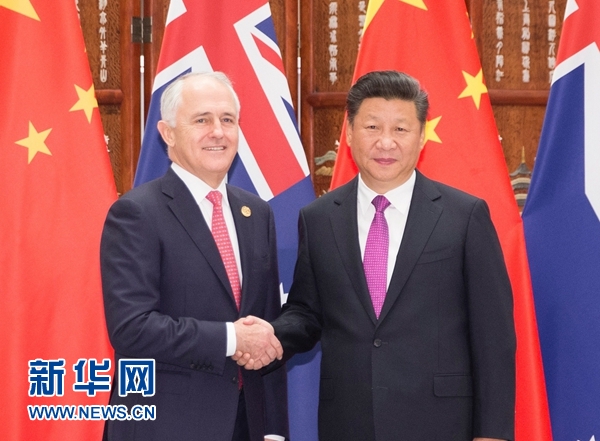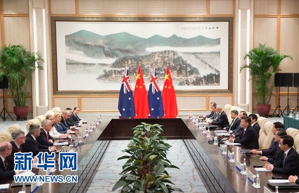 習(xí)近平指出,中方高度重視發(fā)展中澳關(guān)系。希望雙方相向而行,堅(jiān)持互信互利原則,拓展務(wù)實(shí)合作,擴(kuò)大人文交流,推動中澳全面戰(zhàn)略伙伴關(guān)系健康穩(wěn)定向前發(fā)展。互信是保證中澳關(guān)系順利發(fā)展的前提。中澳要尊重彼此對發(fā)展道路的選擇,尊重彼此核心利益和重大關(guān)切。我們要加強(qiáng)優(yōu)勢互補(bǔ),繼續(xù)實(shí)施好中澳自由貿(mào)易協(xié)定,加快推進(jìn)中方“一帶一路”倡議同澳方“北部大開發(fā)”計(jì)劃對接,積極拓展能源資源、農(nóng)牧業(yè)、食品加工、基礎(chǔ)設(shè)施建設(shè)等領(lǐng)域合作,更好實(shí)現(xiàn)互利雙贏。希望澳方繼續(xù)致力于為外資提供公平、透明、可預(yù)期的政策環(huán)境,這也符合澳方自身利益。要深入推進(jìn)創(chuàng)新發(fā)展戰(zhàn)略對接,擴(kuò)大食品、農(nóng)業(yè)、礦業(yè)、海洋科學(xué)等領(lǐng)域聯(lián)合研發(fā)。要深化教育、文化、旅游等領(lǐng)域交流,增進(jìn)兩國人民相互了解和友誼。要加強(qiáng)反腐敗追逃追贓和反恐合作。中方愿同澳方加強(qiáng)在聯(lián)合國、二十國集團(tuán)、亞太經(jīng)合組織、東亞峰會等機(jī)制中的協(xié)調(diào)和合作。