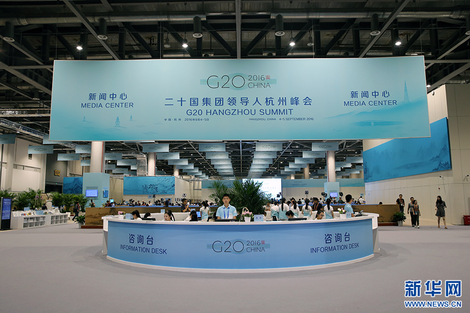 ????9月4日至5日,二十國集團領導人杭州峰會在浙江杭州舉行。全球媒體人匯聚一堂,關注報道峰會盛況。在G20杭州峰會新聞中心,200多位志愿者身著青白色運動服,男生外套上藍下白,象征層巒疊嶂;女生外套上白下藍,意味水波蕩漾。兩者輝映,體現了杭州這座古城湖光山色的獨特風韻。