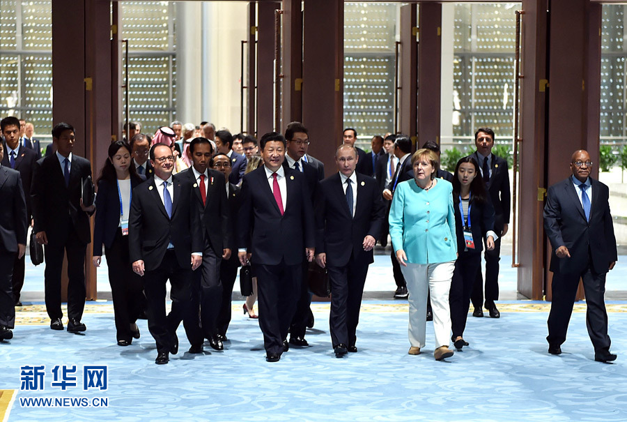 ??? 9月4日,二十國集團領導人第十一次峰會在杭州國際博覽中心舉行。國家主席習近平主持會議并致開幕辭。這是二十國集團成員和嘉賓國領導人、有關國際組織負責人步入會場。新華社記者李濤攝