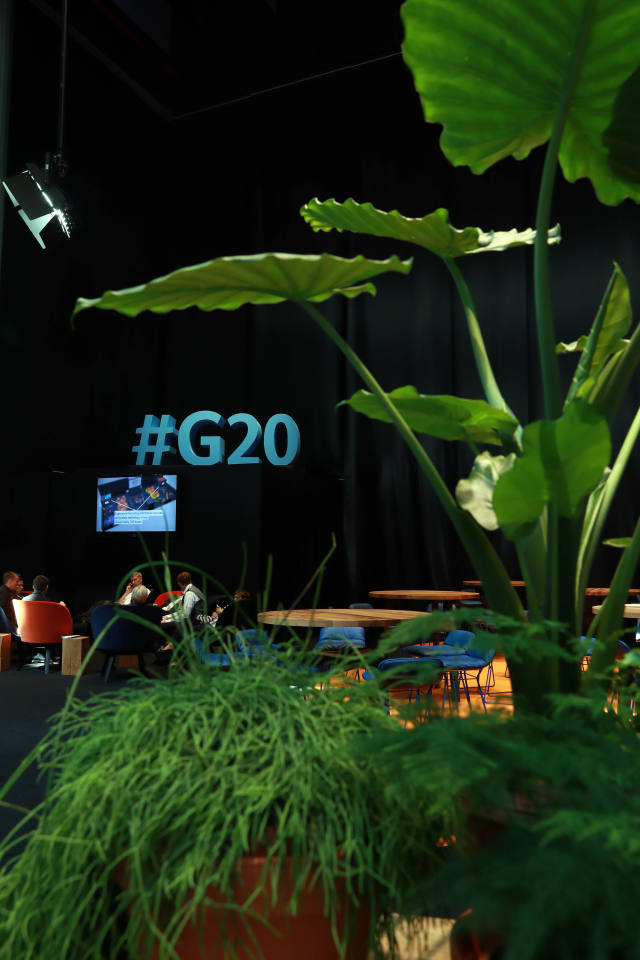↑這是7月6日在德國漢堡拍攝的G20領導人峰會國際新聞中心內擺放的植物。新華社記者羅歡歡攝