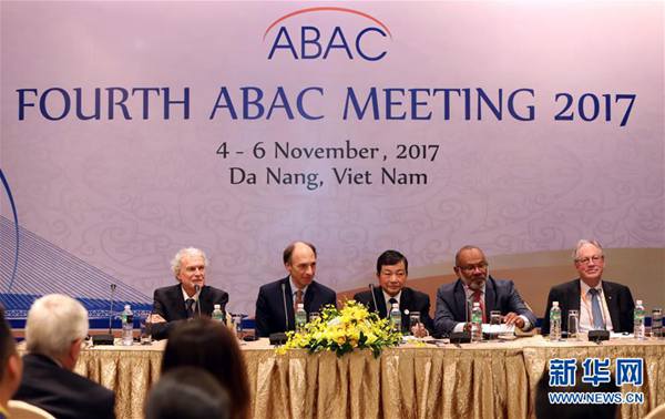 11月6日,在越南峴港,APEC工商咨詢理事會成員代表出席記者會。2017亞太經合組織(APEC)工商咨詢理事會成員6日表示,中國經濟發展對APEC區域經濟發展至關重要,期待中國智慧在推動區域經濟一體化方面發揮更大作用。新華社記者李鵬攝