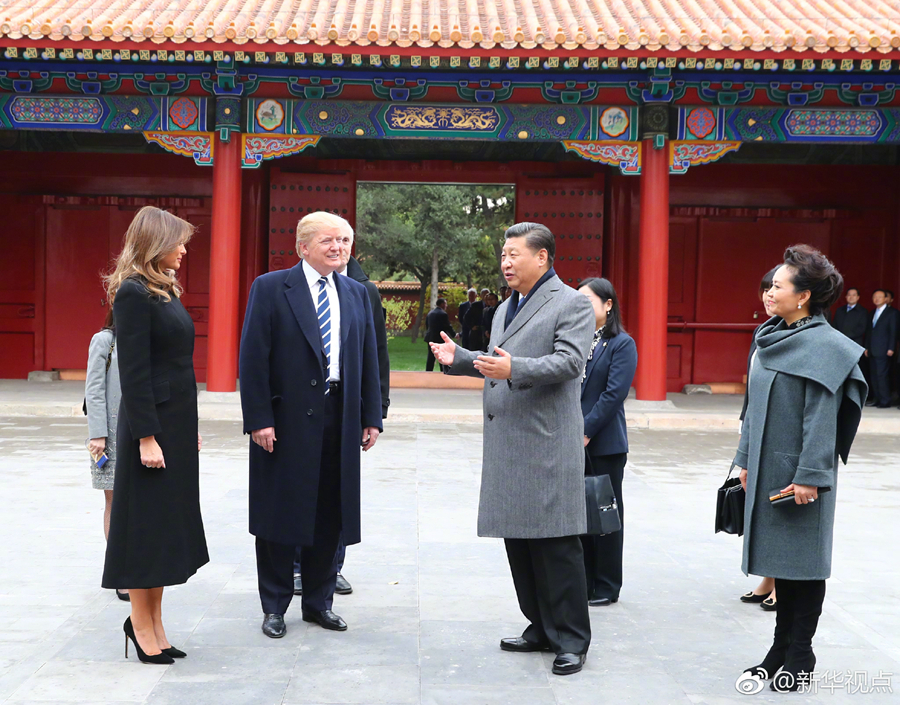 新華網北京11月8日電 國家主席習近平和夫人彭麗媛8日下午在故宮博物院迎接來華進行國事訪問的美國總統特朗普和夫人梅拉尼婭。兩國元首夫婦在寶蘊樓簡短茶敘。