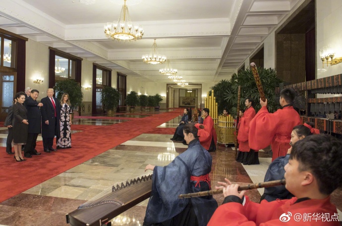新華網北京11月9日電 11月9日,國家主席習近平在人民大會堂同美國總統特朗普舉行會談。會談前,習近平在人民大會堂東門外廣場為特朗普舉行歡迎儀式。(據新華社“新華視點”微博報道 攝影:新華社記者蘭紅光、李學仁、饒愛民、李濤)?