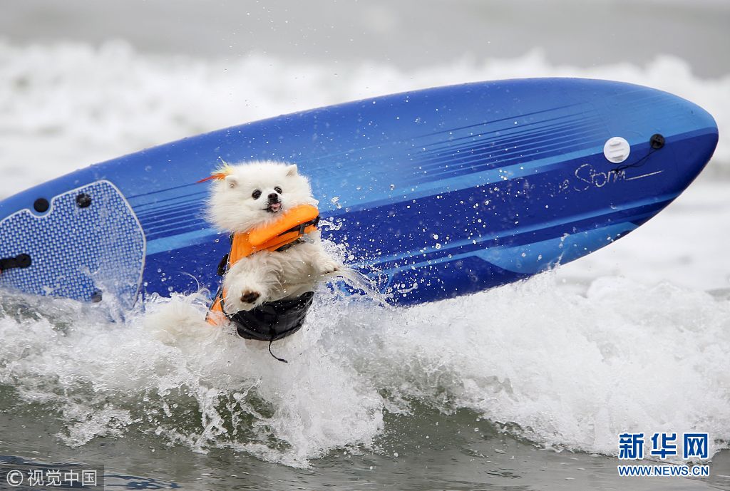 當地時間2015年8月1日,美國加利福尼亞州因皮里爾灘舉辦第十屆狗狗沖浪比賽,可愛“汪星人”海浪中展開激烈角逐。(圖片來源:視覺中國)