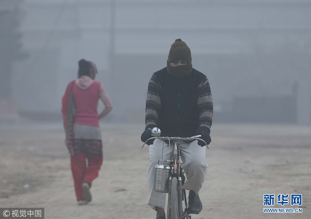 當地時間1月2日,印度新德里遭遇冷空氣及強霧霾天氣,能見度低。(圖片來源:視覺中國)