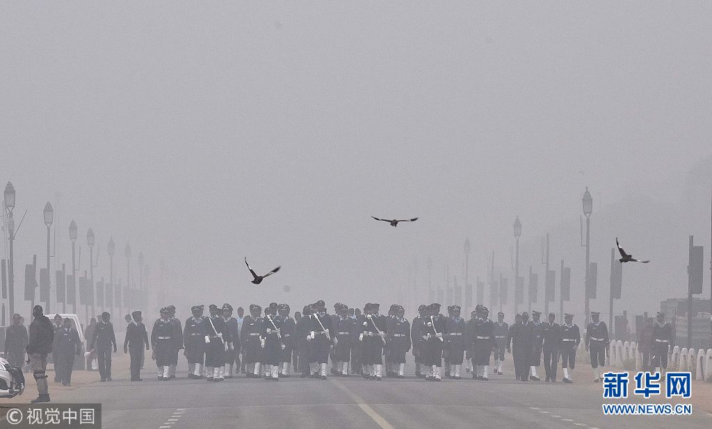 印度新德里遭遇強霧霾 士兵排練閱兵遭“霾藏”