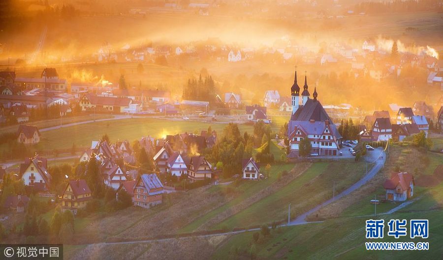 1月10日訊(具體拍攝時間不詳),波蘭皮耶尼內山脈的一個村莊被濃霧籠罩,攝影師站在對面山上拍攝的景觀如童話世界一般,色彩繽紛的房子在濃霧中若隱若現仿若仙境。(圖片來源:視覺中國)