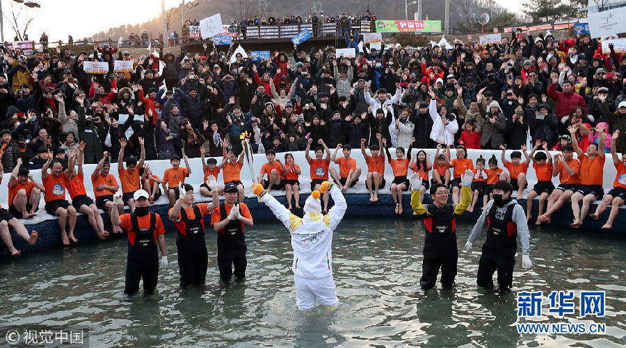 韓國奧運圣火傳遞在鱒魚慶典場地舉行 火炬手嘴含活魚拍照