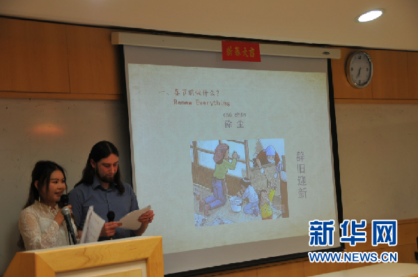 活動現場,女主持人劉津巧介紹春節的傳統習俗。新華網發 劉學攝