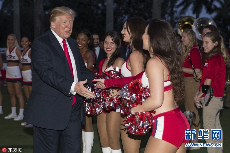 當(dāng)?shù)貢r(shí)間2018年2月4日,美國佛州西棕櫚灘,美國總統(tǒng)特朗普與第一夫人梅拉尼婭在高爾夫俱樂部觀看大學(xué)生樂隊(duì)的歡迎演出,與美女啦啦隊(duì)員握手。據(jù)悉,特朗普夫婦出席在該俱樂部舉辦的超級碗派對。(圖片來源:東方IC)