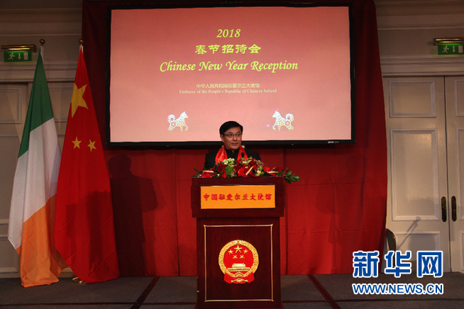 2月8日, 在愛爾蘭首都都柏林, 中國駐愛爾蘭大使岳曉勇在春節招待會上致辭。新華網發(張琪攝)