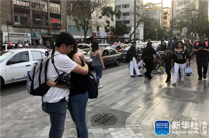 2月16日,在墨西哥首都墨西哥城,人們在戶外避險。新華社記者李文清攝
