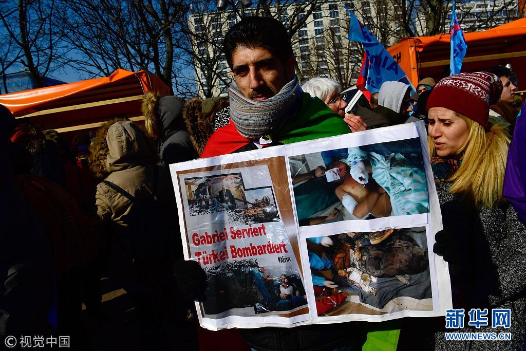 當(dāng)?shù)貢r(shí)間2018年3月3日,德國(guó)柏林,當(dāng)?shù)孛癖娕e行游行,抗議土耳其對(duì)敘利亞阿夫林地區(qū)的庫爾德人采取軍事行動(dòng)。(圖片來源:視覺中國(guó))