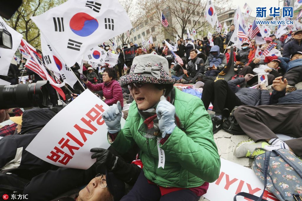 當(dāng)?shù)貢r(shí)間2018年4月6日,韓國首爾,在首爾中央地方法院前,韓國前總統(tǒng)樸槿惠的支持者在得知樸槿惠一審獲刑24年后,舉行集會(huì)游行。據(jù)報(bào)道,首爾中央地方法院對(duì)韓國前總統(tǒng)樸槿惠作出一審宣判,判處其有期徒刑24年,罰款180億韓元(約合人民幣1.06億元)。(圖片來源:東方IC)
