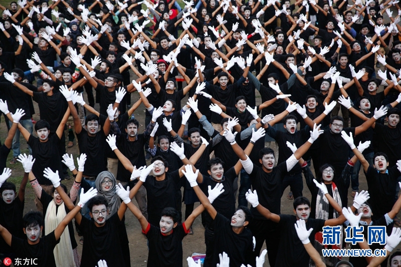 當地時間2018年4月8日,孟加拉國達卡,2018年國際啞劇節在達卡開幕,超過254名啞劇演員齊聚達卡大學參加表演,成為全世界啞劇演員最多的表演節目,破吉尼斯世界紀錄。(圖片來源:東方IC)