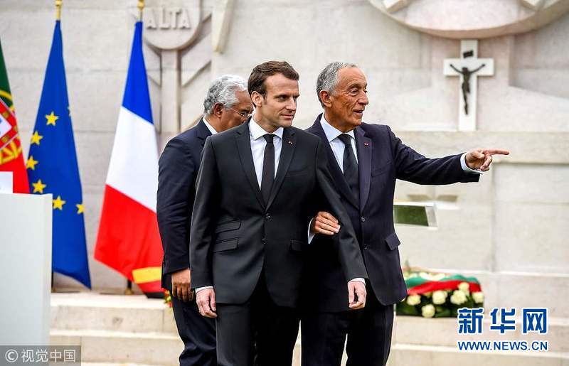 4月9日,法國里什堡,法國總統馬克龍和葡萄牙總統馬塞洛·雷貝洛·德索薩在一戰葡萄牙公墓出席一戰紀念儀式,紀念利斯戰役百年。(圖片來源:視覺中國)