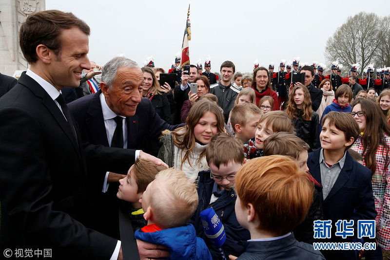 4月9日,法國里什堡,法國總統馬克龍和葡萄牙總統馬塞洛·雷貝洛·德索薩在一戰葡萄牙公墓出席一戰紀念儀式,紀念利斯戰役百年。(圖片來源:視覺中國)